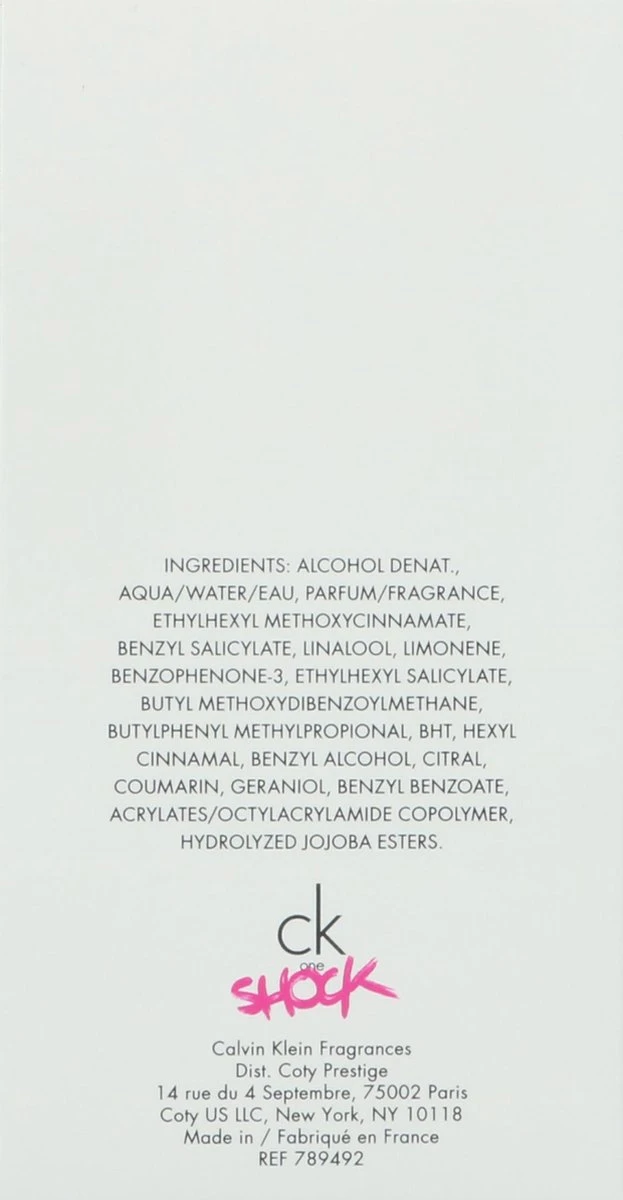 De geuropening is discreet fris en zacht. De topnoot van sierlijke passiebloem, delicate rode papaver en volle bloeiende pioenroos verspreidt de charme van een milde zomerwind, die de eerste hints van de volgende volheid van aroma’s met zich meebrengt. Mexicaanse chocolade en bitterzoete bramen domineren het geurakkoord. Bewitching jasmijn en dauwrijke narcissen voegen sierlijke vrouwelijke elegantie toe met een zachte toets van bloesem. De basisnoot van Calvin Klein CK One Shock for Her is pure sensualiteit. De betoverende geur van vanille, warme, zachte muskus en onweerstaanbare ambergris associëren een opwindend zwoele zomeravond. Na talrijke uniseks composities is de langverwachte eerste zomergeur van het luxe label Calvin Klein uniek door de diepte en intensiteit van de accenten. De langdurige Sillage is vol glamour, sensualiteit en elegantie.